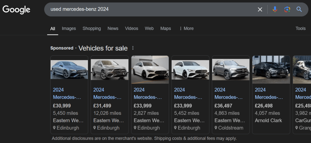 Google is changing quickly. After some years of closed betas, Google's Vehicle Listings on Google Shopping are finally here for all advertisers. By leveraging Performance Max campaigns, businesses can now effectively manage and optimise their vehicle listings to maximise visibility (see below Google Shopping Listing example) and drive sales. We could not wait longer so here is how we got started and the results achieved so far.